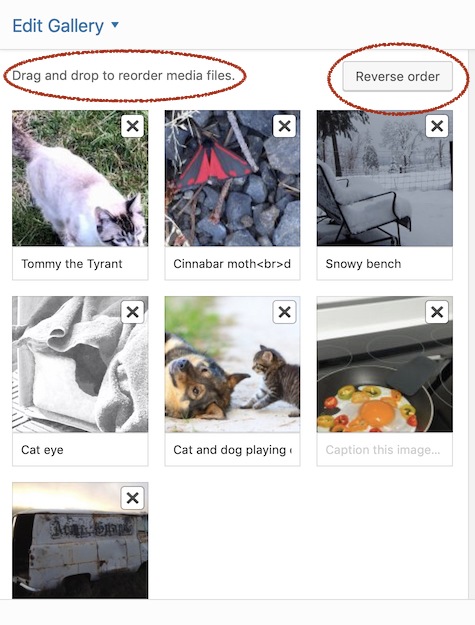 The ordering of the photos in both the Collage and Thumbs layouts matches the WordPress media gallery order that you set up. When you create or edit the WordPress gallery, you can reorder the images by dragging and dropping.